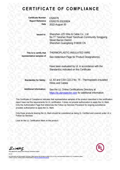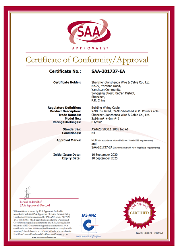 深圳建圳達電線電纜有限公司,成立于2000年,是一家電線電纜制造商,我們通過了世界各地不同市場的多數(shù)認證,如:CCC、RoHS、CB、SAA、TUV、VDE、PSE、BPS、UL、CSA。我們根據(jù)定制產(chǎn)品不斷更新新的認證。經(jīng)過數(shù)十年的發(fā)展,我們與來自世界各地的客戶建立了長期的合作關(guān)系。我們曾經(jīng)是菲律賓機場,,柬埔寨的電力站,美國的醫(yī)院,工廠,埃塞俄比亞的水電站項目。我們是一家值得信賴的電線供應商。